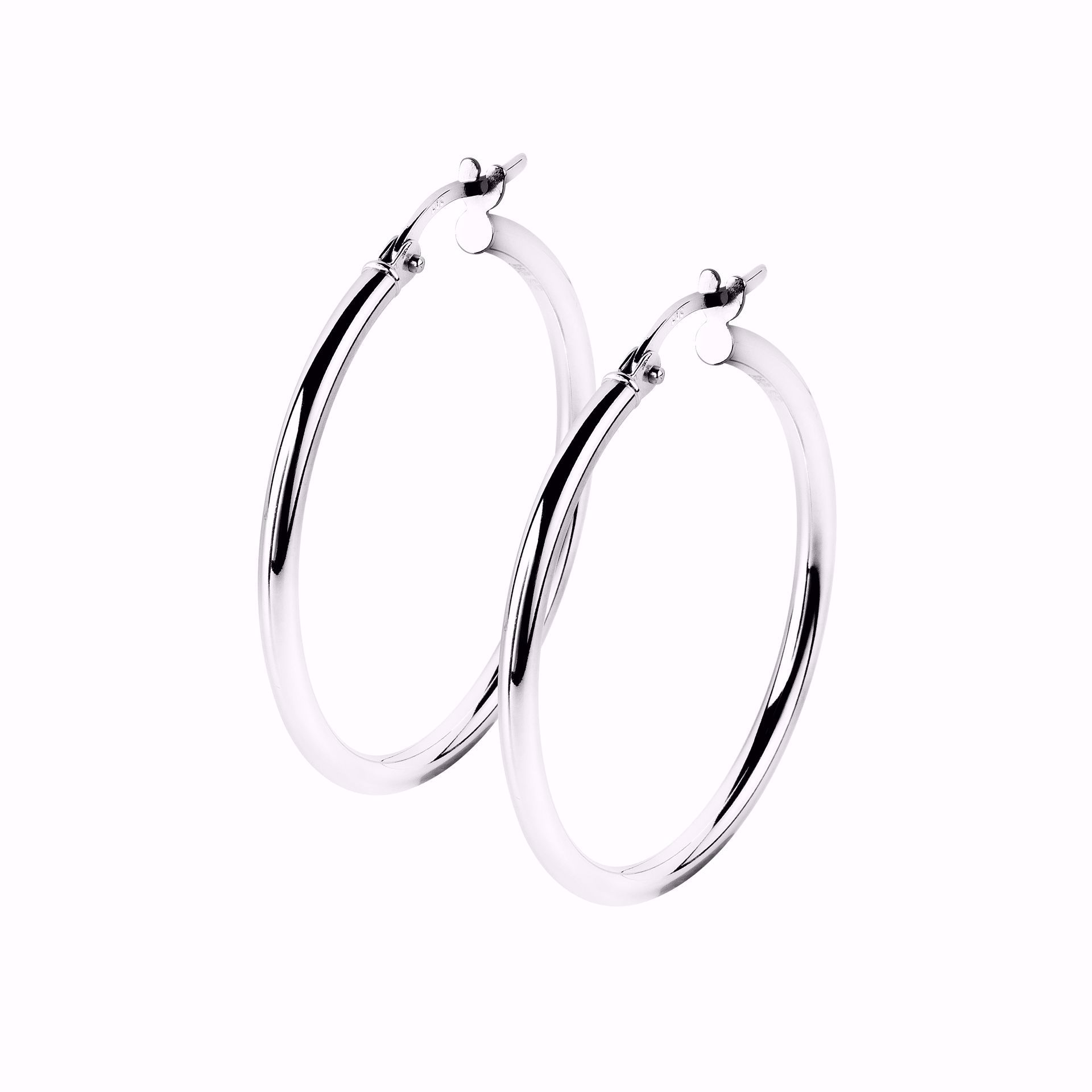 Eksklusive øreringer i hvitt gull er en sikker vinner til enhver anledning. Med sitt tidløse og klassiske utseende er disse øredobbene like fine til hverdag som til fest. Øreringene er lette og behagelige og lukkes med en enkel og sikker sakselås. Bredde: 2 mm. Diameter: 29 mm. Materiale: 585 hvitt gull.