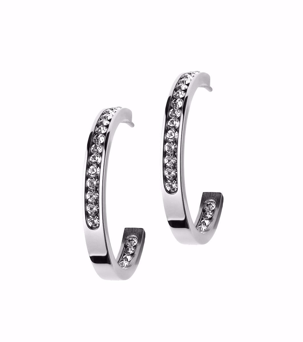 Øreringer i stål med zirkonia. Diameter 27 mm.