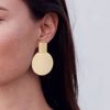 Lekre ørepynt i stål. Rektangelen har en størrelse på 15 x 17 mm, sirkelen har diameter på 50 mm.