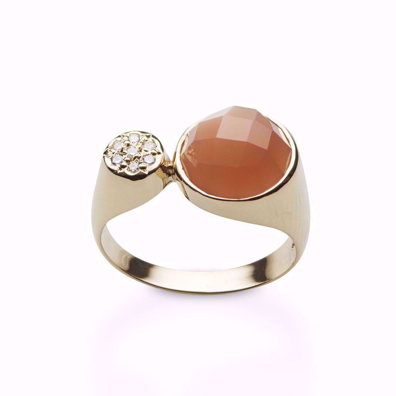 Bon Bon Avec-ringen fra norske Arven er så lekker! Prydet med en fasettert ferskenmånesten (10 mm. diameter) og glitrende diamanter skaper den et virkelig lekkert uttrykk. Ringen er flott alene, eller i kombinasjon med andre ringer i Bon Bon-kolleksjonen. Ringen topper antrekket ditt perfekt - uansett anledning. Materialer: 585 gult gull, ferskenmånesten og diamanter. Totalvekt av diamanter: 0,07 ct. Diamantkvalitet: WSI. Diamantslip: Brilliant. Lagerført størrelse: 54.