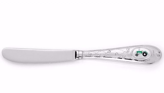 Flott barnekniv i stål med grønn traktor og detaljer i 925 sterlingsølv og glassemalje. Fin og nyttig gave til baby og barn! Lengde: 14 cm.