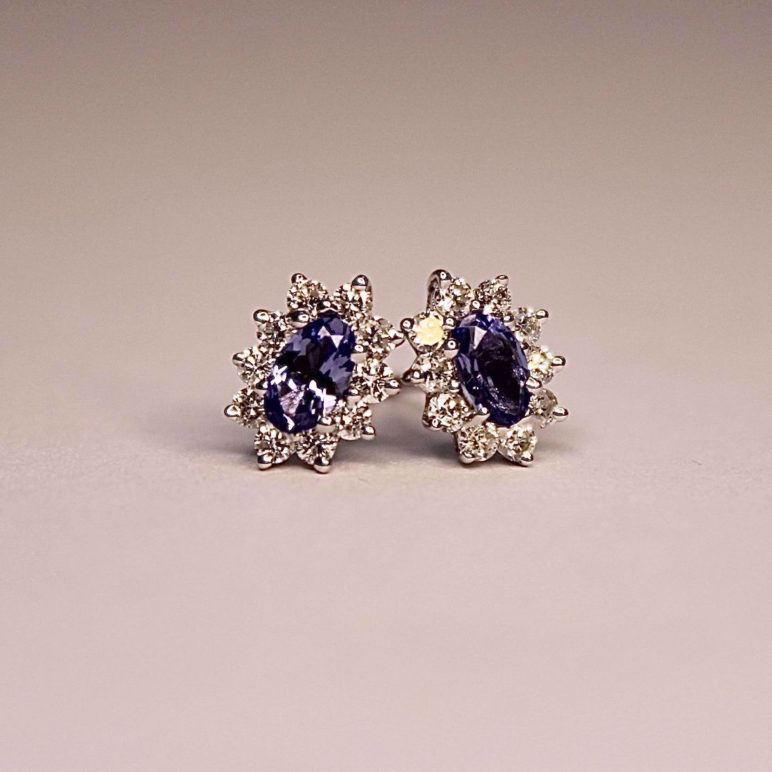 Et par virkelig strålende vakre øredobber i nydelige farger - laget i hvitt gull, prydet med en tanzanitt i senter. Rundt tanzanitten er det fattet glitrende diamanter. Vi elsker disse stilfulle og klassiske øredobbene, og synes de er like fine til hverdag som til festlige anledninger. Materialer: 585 hvitt gull, tanzanitt og diamanter: Totalvekt av diamanter: 0,38 ct. Totalvekt av tanzanitt: 0,50 ct. Diamantkvalitet: TWP1. Diamantslip: Brilliant.