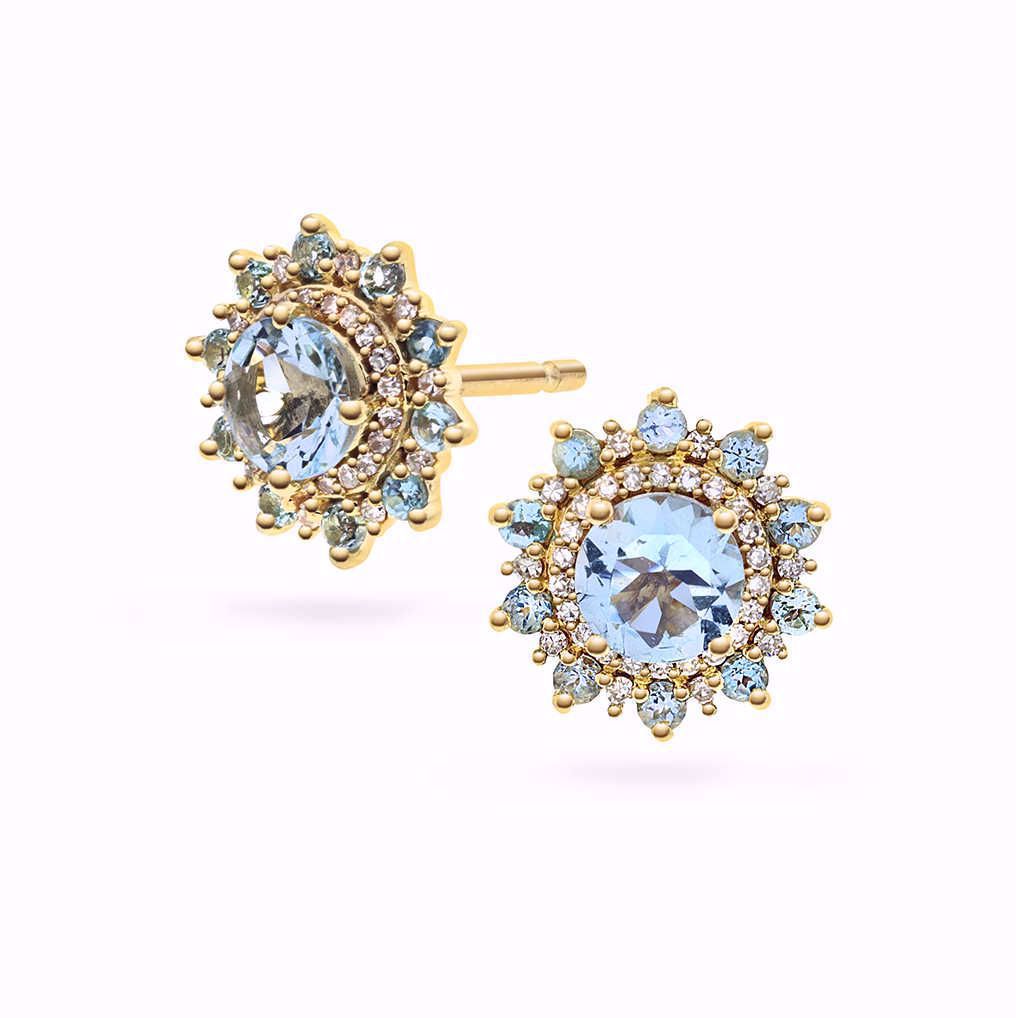 Disse vakre øredobbene er virkelig et blikkfang! Gult gull, besatt med vakre, blå akvamariner, omkranset av diamanter. En skatt til smykkesamlingen! Med sitt elegante og tidløse design er dette øredobber som passer godt til alle anledninger. Bruk dem som en vakker kontrast til jeans, eller bruk dem som topping til din fineste kjole. Materialer: 585 gult gull, akvamarin og diamanter. Totalvekt av diamanter: 0,08 ct. Diamantkvalitet: WP. Diamantslip: Brilliant. Øredobbenes diameter: 9 mm.