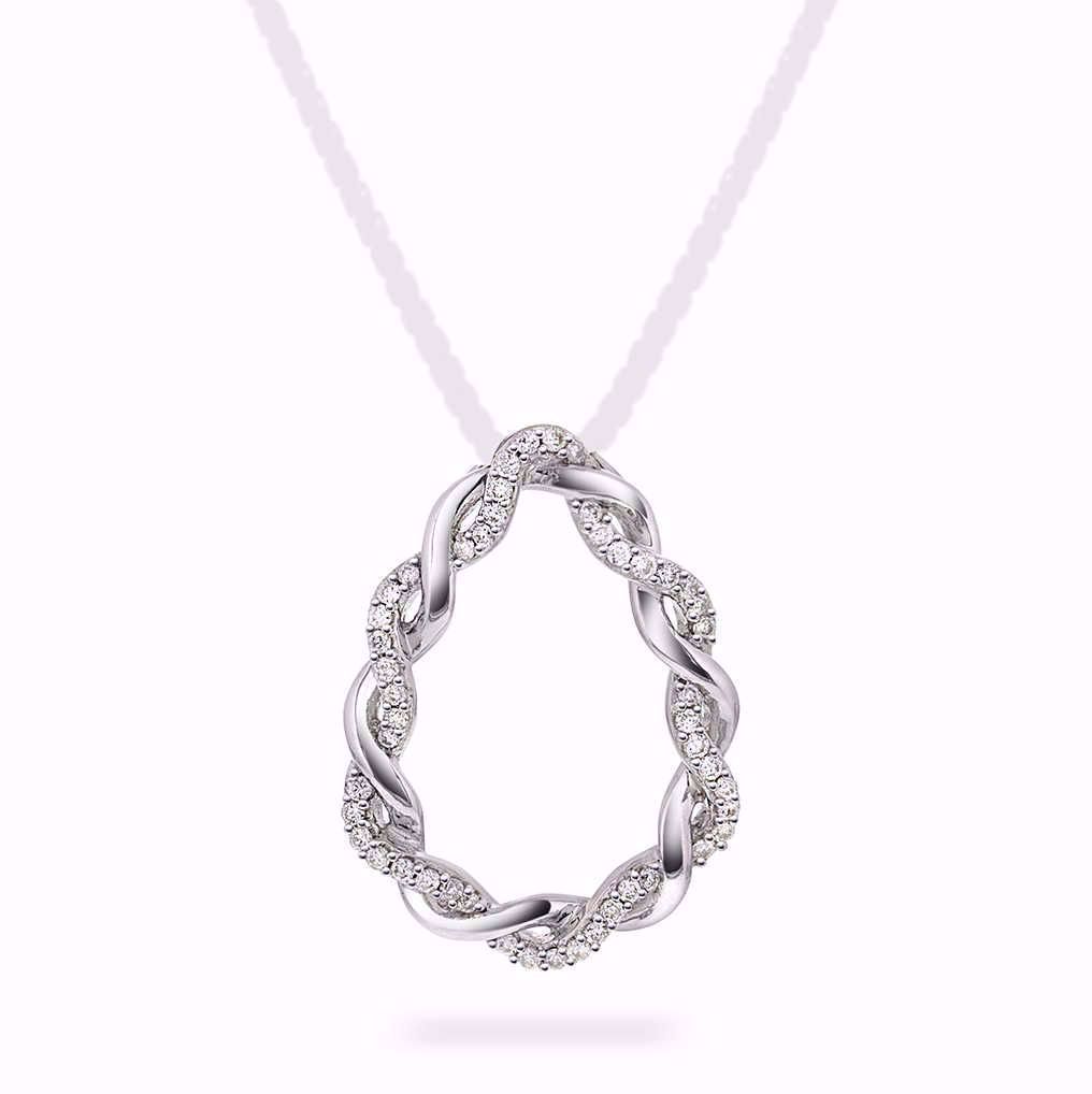 Dette smykket er for deg som liker det eksklusive og klassiske med en annerledes touch. Anhenget er i hvitt gull, med lekre tvinnede detaljer, besatt med 31 glitrende diamanter. Dråpeformen er virkelig lekker! Anhenget passer like godt til en dag på kontoret som til en kveld ute. Bruk smykket alene eller sammen med flere av dine andre favorittsmykker. Høyde anheng: 20 mm. Bredde: 14 mm. Kjede selges separat. Materialer: 585 hvitt gull og diamanter. Totalvekt av diamanter: 0,15 ct. Diamantkvalitet: WP. Diamantslip: Brilliant.