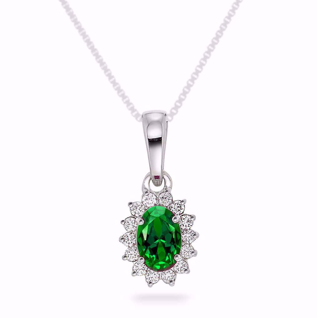 uttrykk, og passer dermed like godt til hverdag som til fest. Vær oppmerksom på at smaragdens farge kan variere fra bildet, da det er naturlige stener. Anhengets høyde: 15,5 mm. Bredde: 7,5 mm. Kjede selges separat. Materialer: 585 hvitt gull, smaragd og diamanter. Totalvekt av diamanter: 0,14 ct. Diamantkvalitet: WSI. Diamantslip: Brilliant.