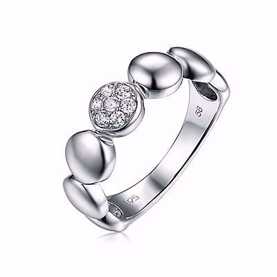 En flott og iøynefallende diamantring med lekkert, unikt design. Ringens topp er sammensatt av halvkuler, hvor den ene er besatt med diamanter fattet i rosett. Lekkert tilbehør til ethvert antrekk! Materialer: 5858 hvitt gull og diamanter. Totalvekt av diamanter: 0,09 ct. Diamantkvalitet: WSI. Diamantslip: Brilliant. Ringens bredde: 6,2 mm. Lagerført størrelse: 56.