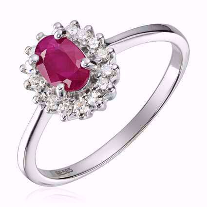 Diamantring, rosett - 585 hvitt gull med rubin og diamanter 0,16 ct. WSI
