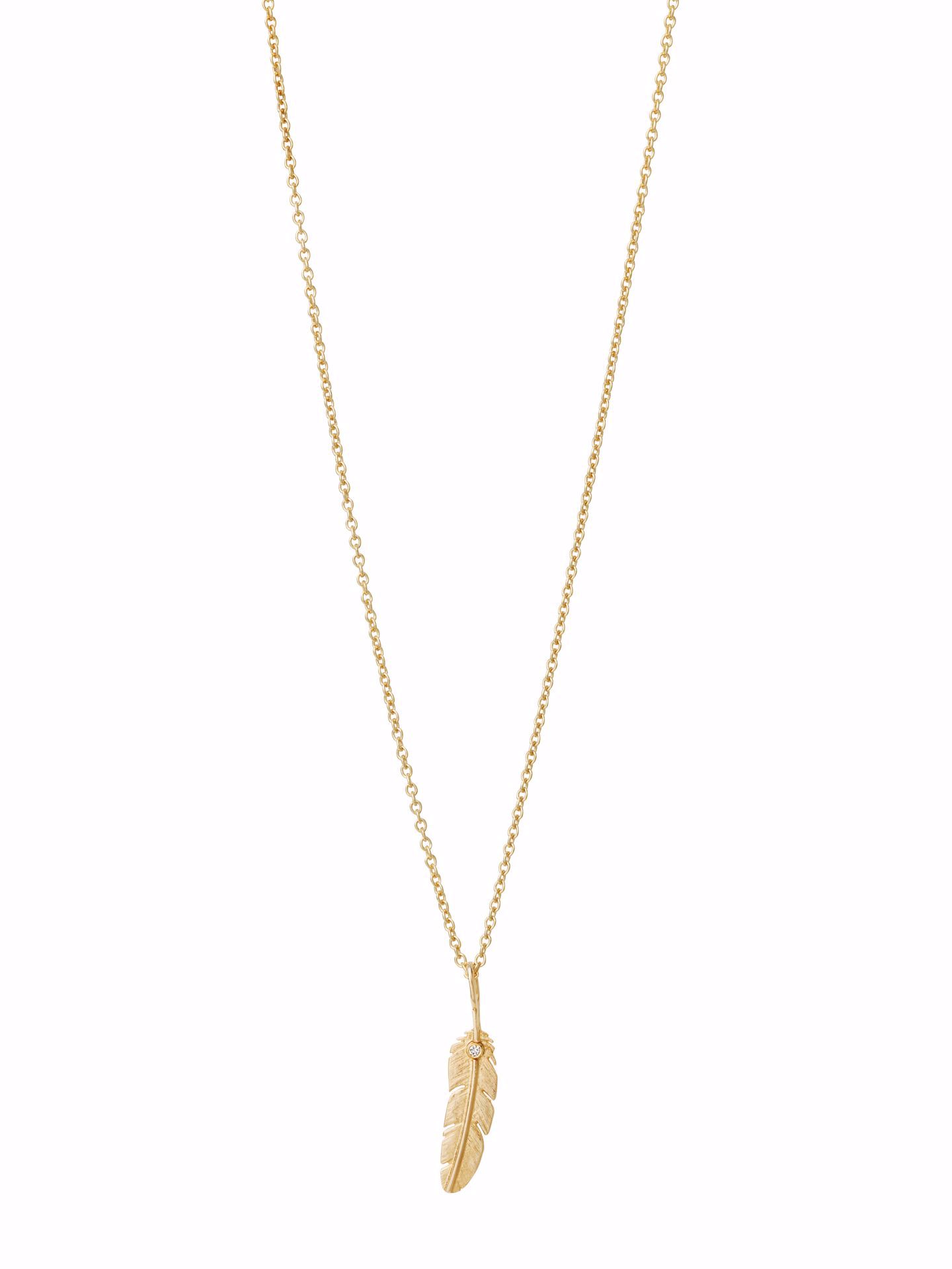 Feather-anhenget fra Heiring er inspirert av naturen, formet som en delikat fjær. Øverst på fjæren er det fattet en glitrende diamant. Overflaten er lett børstet og står i nydelig kontrast til den vakre diamanten. Et klassisk, men samtidig annerledes smykke - for deg som liker unik, håndlaget design. Kjede selges separat. Materialer: 585 gult gull og diamant. Totalvekt av diamant: 0,02 ct. Diamantkvalitet: WVS. Diamantslip: Brilliant.