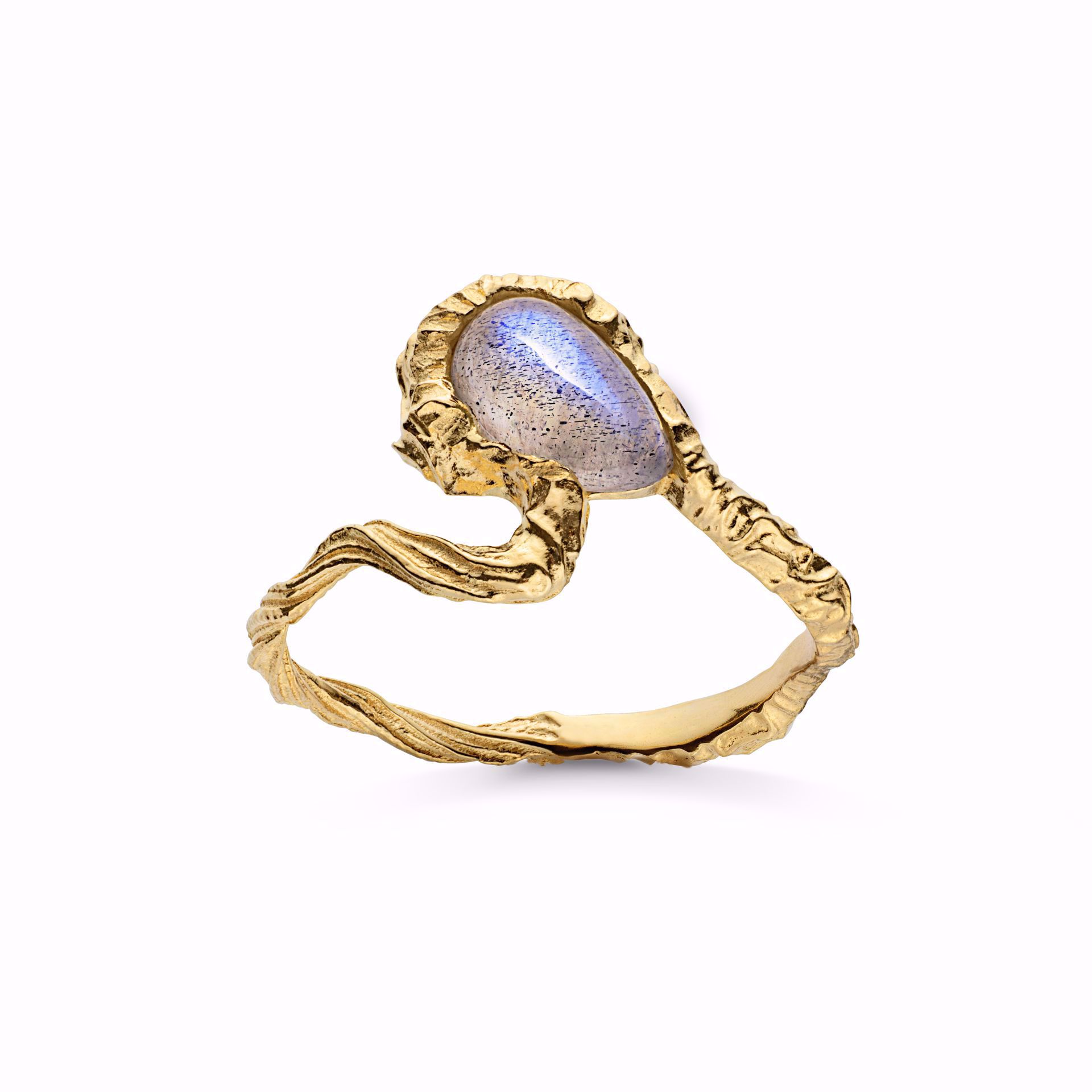 Alba ringen har en fin tvinnet og bølget tekstur, som sammensmeltes med en flott mandelformet labradoritt. Materiale: Sterlingsølv (925), belagt med 18 karat gull, labradorit
