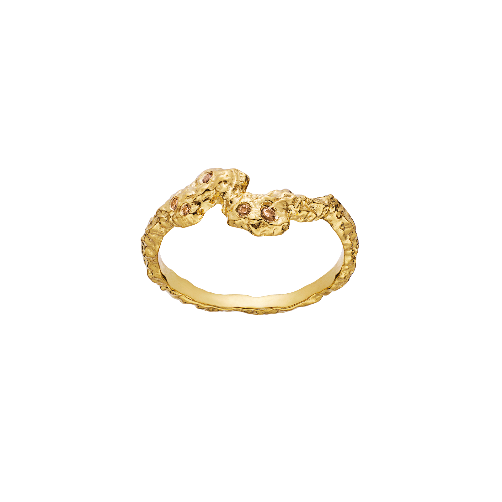 Søt ring i gullforgylt sølv med zirkonia fra Maanesten. Vi elsker kontrasten mellom den rå overflaten og de blanke stenene! Bruk den alene, eller stack den med dine andre favorittringer fra Maanesten.