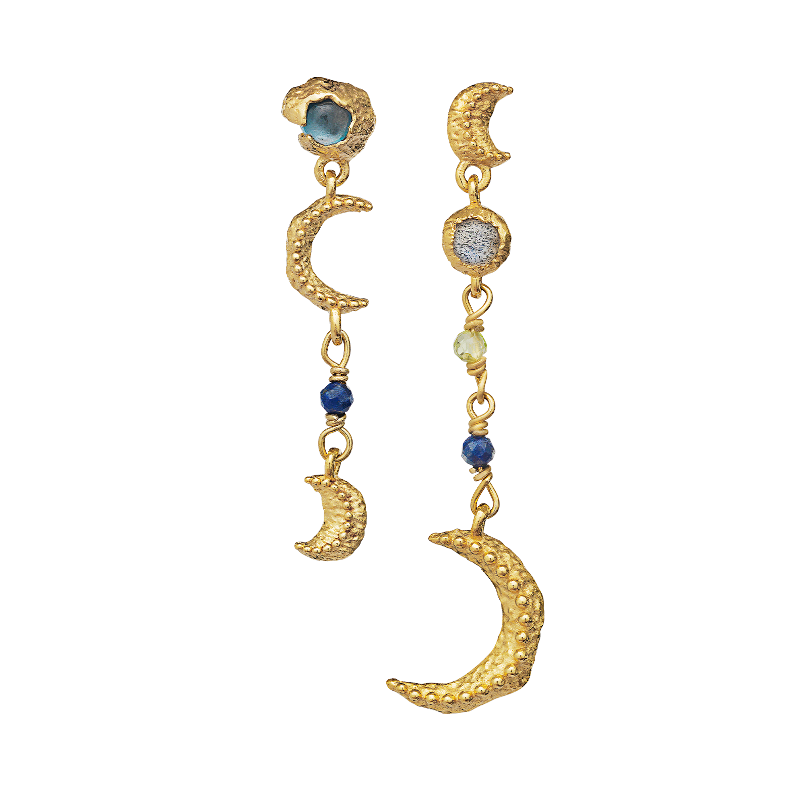 Nydelig og delikat ørepynt i gullforgylt sølv. Den asymmetriske fasongen skaper et morsomt utrykk. Øredobbene er fattet med labradoritt, peridot, lapis lazuli og london blå topas.