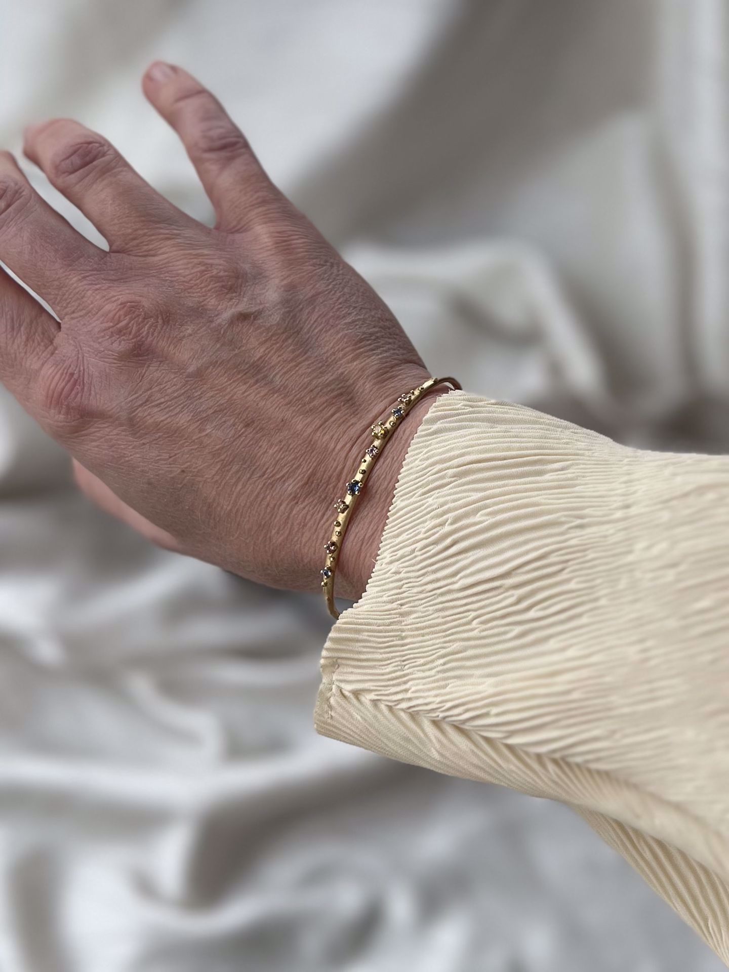 En virkelig vakker og unik armring fra Noën Jewellery. Med sin lett børstede overflate kombinert med glitrende safirer, skaper armbåndet et kontrastfylt og unikt uttrykk som vi simpelthen elsker! Noën lager smykker for deg som verdsetter håndlaget kvalitet, og de oser av stil. Materialer: 585 gult gull med lett børstet overflate. Rosa, blå og gule safirer (total 8 stk.). Innvendig diameter på langs: 6,3 cm. Innvendig høyde (målt på det høyeste): 4 cm. Armringen har ikke lås, men er utformet som en cuff som tres på armen.