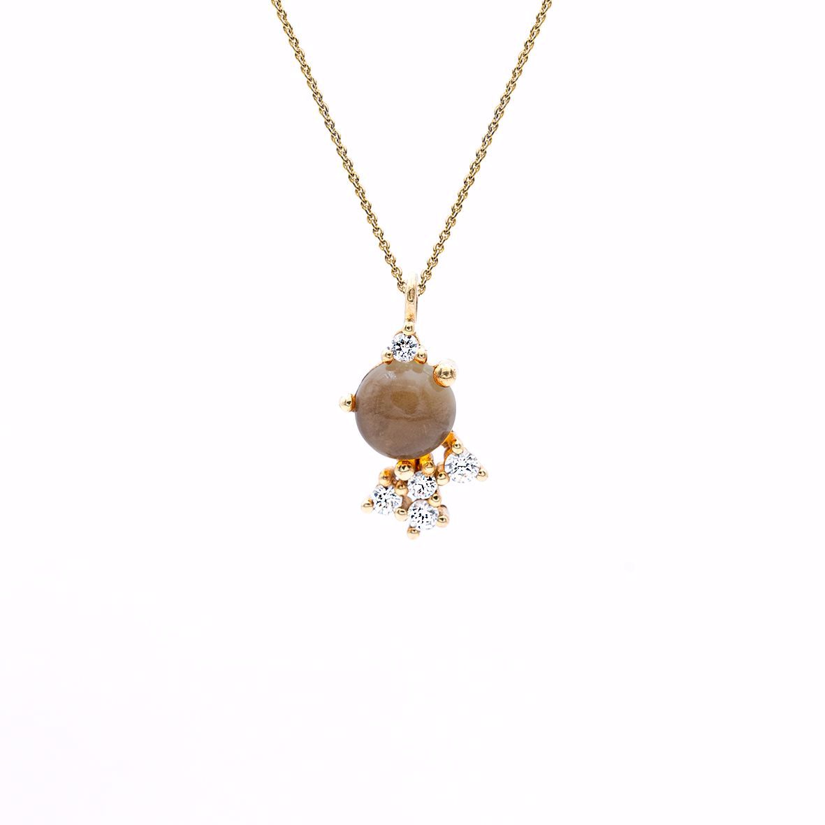 glitrende diamanter. Anhenget er fattet med en cabouchonslipt røkkvarts i senter og