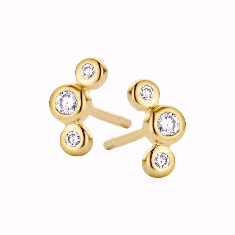 Skjønne og delikate små øredobber laget i ekte gull, prydet med diamanter. Trinity-øredobbene er fine alene, og fine for deg som har flere hull. De skaper en eksklusiv og lekker look, samtidig som de har morsomme og lekne detaljer. Vi elsker disse øredobbene! Kjøp dem som en luksusgave til deg selv, eller til noen du er glad i. Materialer: 585 gult gull og diamanter. Totalvekt av diamanter: 0,10 ct. Diamantslip: Brilliant.